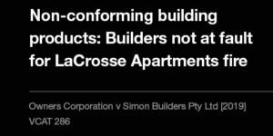 On the early morning of 25 November 2014, a sole unextinguished cigarette on a balcony started a fire that consumed the side of the LaCrosse Apartments, caused an evacuation of some 500 people, and led to a claim for $24 million in damages. In the first decision regarding the fire, the builder avoided liability. Instead, … Continue reading Non-conforming building products: Builders not at fault for LaCrosse Apartments fire