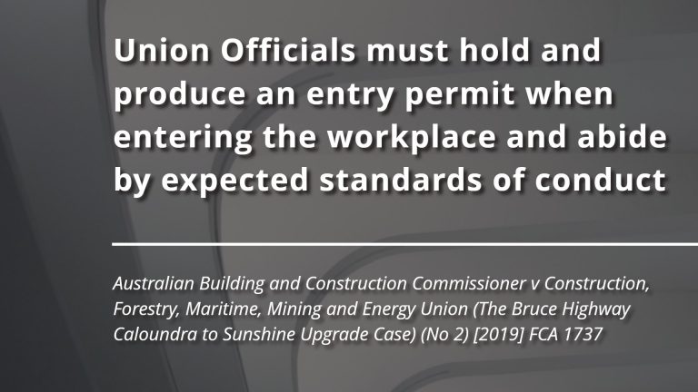 The Federal Court of Australia has recently confirmed that, when entering the workplace, union officials: must hold and produce an entry permit, including if they are exercising a right to enter a workplace under s.81(3) of the Workplace Health and Safety Act 2011 (Qld) (WHS Act); and must not act in an improper manner, with … Continue reading Union Officials must hold and produce an entry permit when entering the workplace and abide by expected standards of conduct